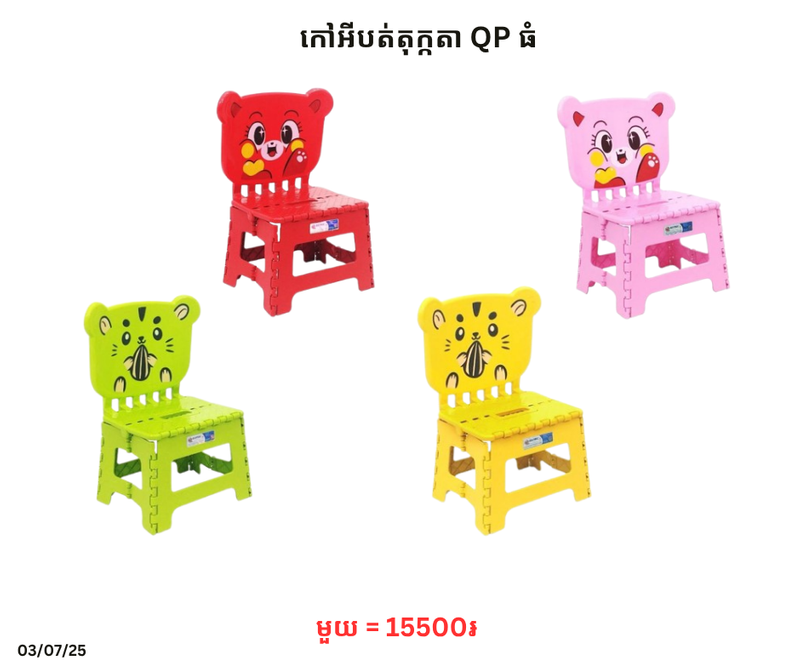 កៅអីបត់តុក្កតា QP ធំ January 3, 2026 Posted in 15500, QP, កៅអី, កៅអីបត់, កៅអីបត់តុក្កតា, កៅអីបត់តុក្កតា QP, កៅអីផ្អែក